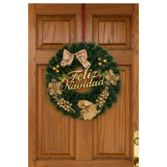 Această coroniță decorativă de Crăciun cu diametrul de 40 cm este o alegere elegantă și festivă pentru decorarea oricărui spațiu în perioada sărbătorilor de iarnă. Realizată din crenguțe sintetice verzi cu aspect natural, bogate și dese, coronița este decorată cu o varietate de ornamente atent asortate care oferă un efect vizual spectaculos: o fundă textilă rafinată, globuri aurii lucioase, frunze decorative, flori aurii tip poinsettia, ciorchini de bobițe sclipitoare și un mesaj central elegant "Feliz Navidad" din plastic auriu strălucitor.