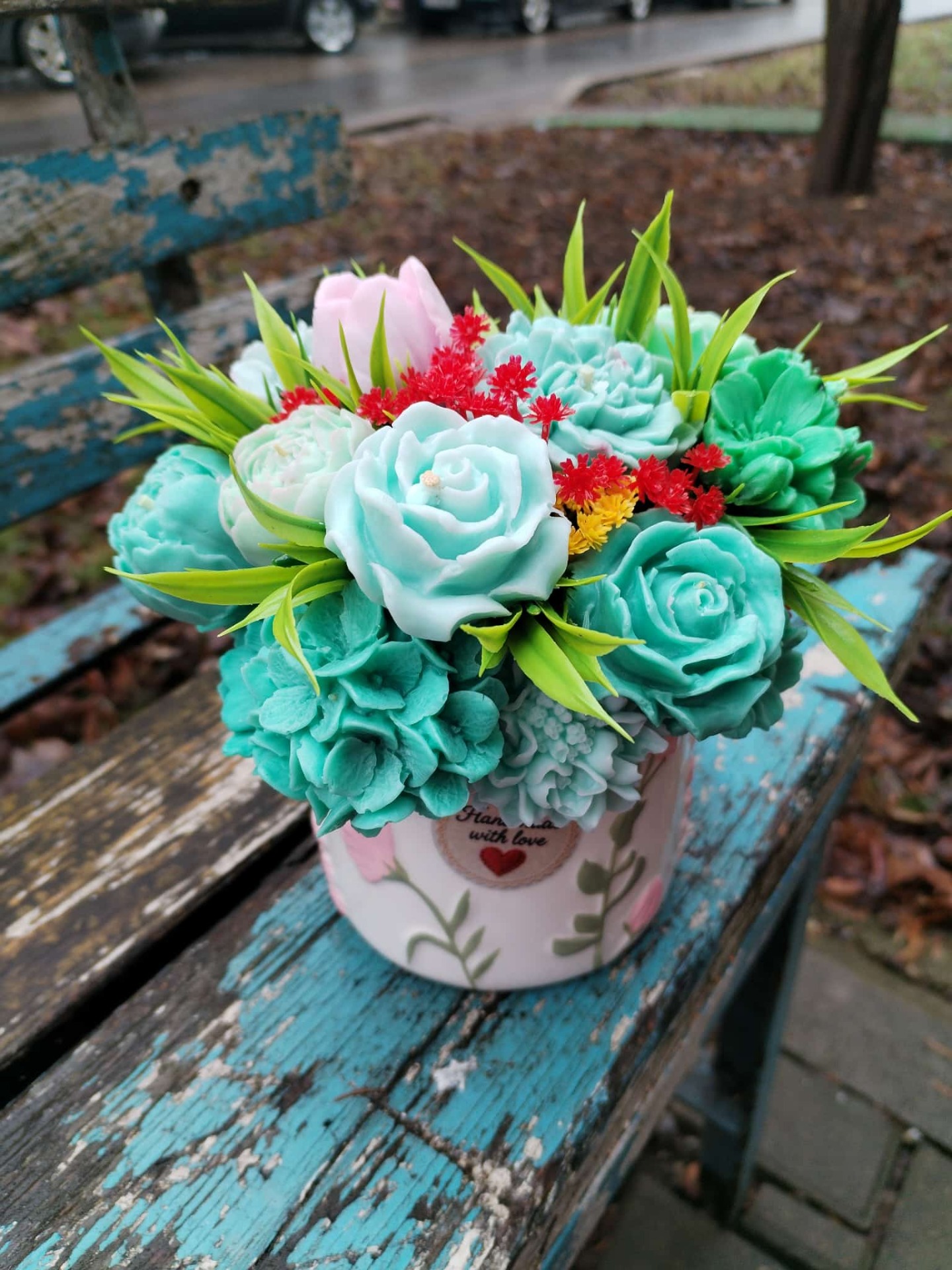 Un aranjament delicat realizat manual din flori de săpun, creat pentru a aduce un strop de rafinament și prospețime în orice spațiu. Florile au un aspect realist, culori armonioase și un parfum plăcut, fiind o alternativă de durată la florile naturale. Ideal pentru decor, cadou sau momente speciale.