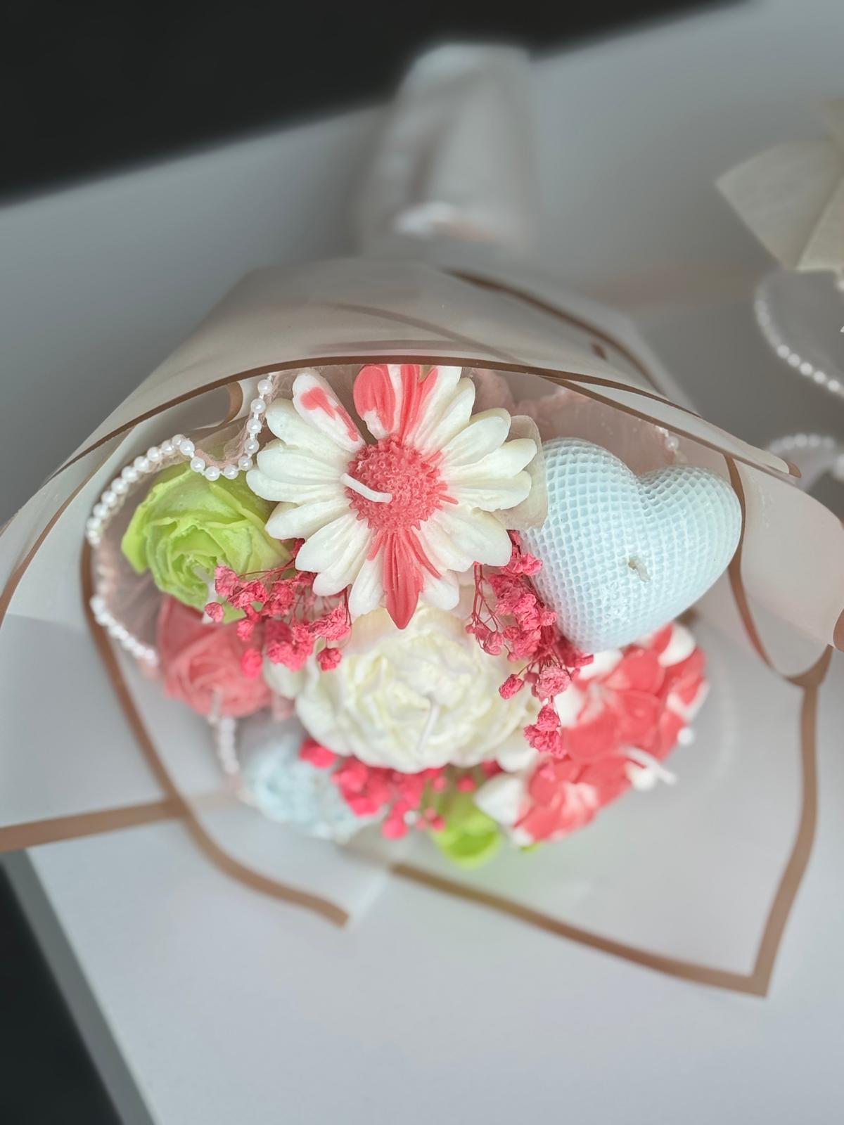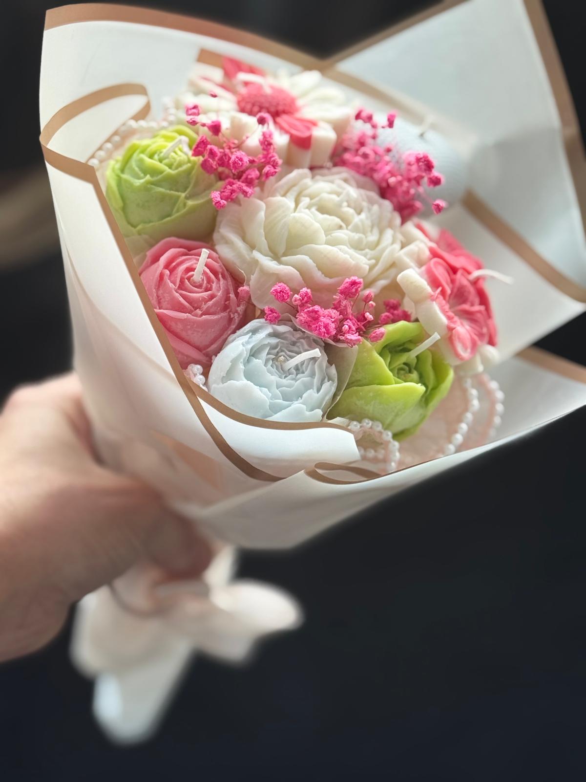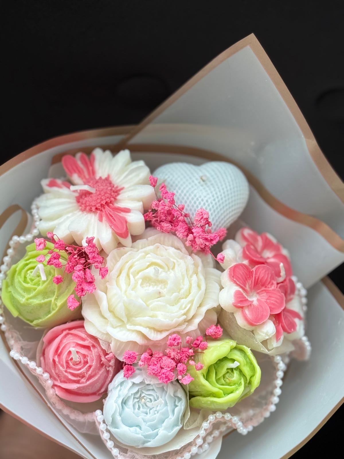 Buchet elegant realizat manual din lumânări din ceară de soia naturală, modelate în formă de flori delicate (trandafiri și flori decorative), atent aranjate într-un ambalaj premium cu detalii fine.