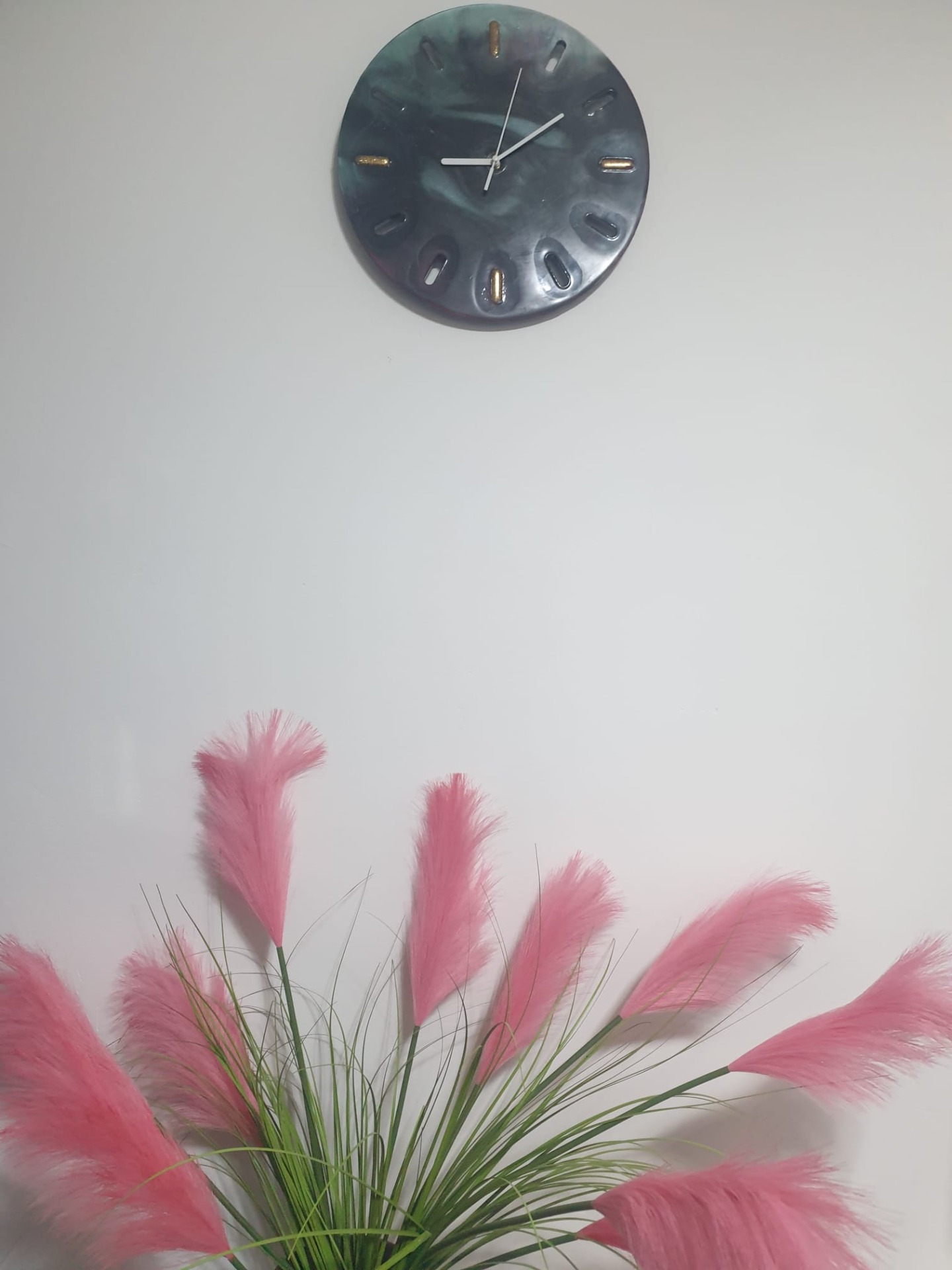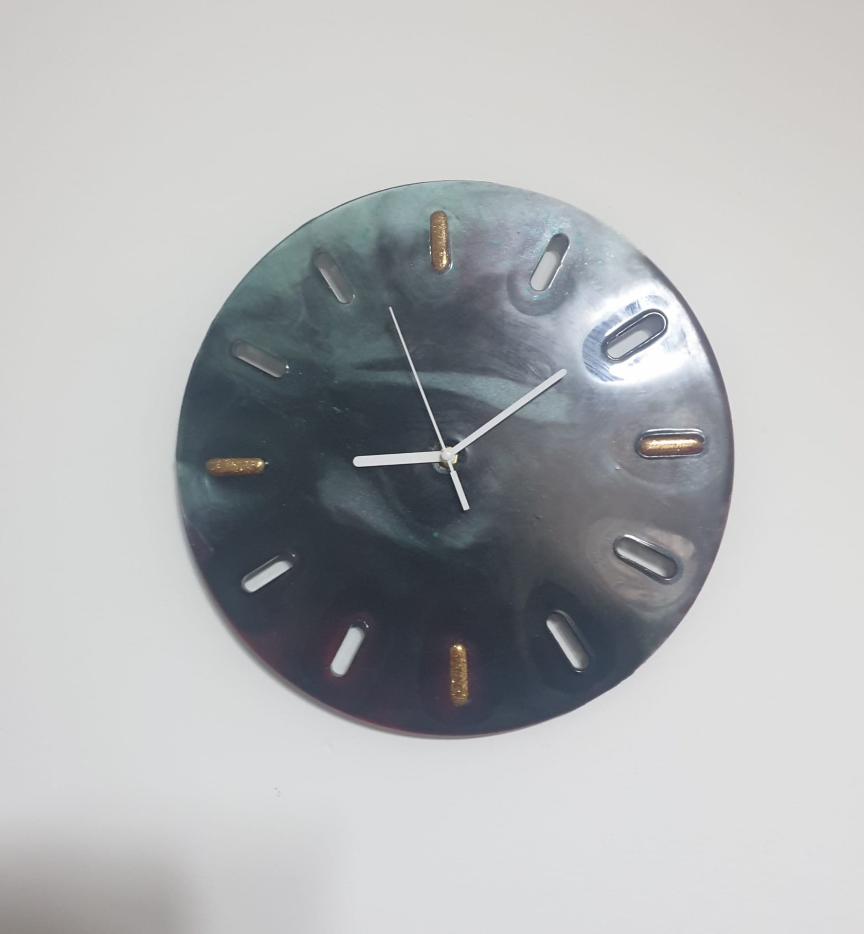 eas de perete realizat manual, unicat, fabricat din rășină epoxidică de înaltă calitate, cu diametrul de 35 cm. Designul sobru, în nuanțe elegante, îl face potrivit pentru birouri, spații de lucru sau interioare moderne.