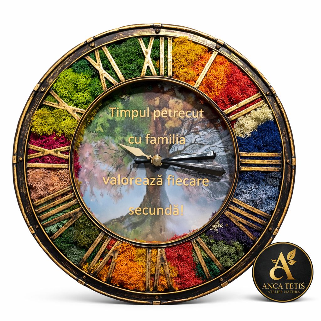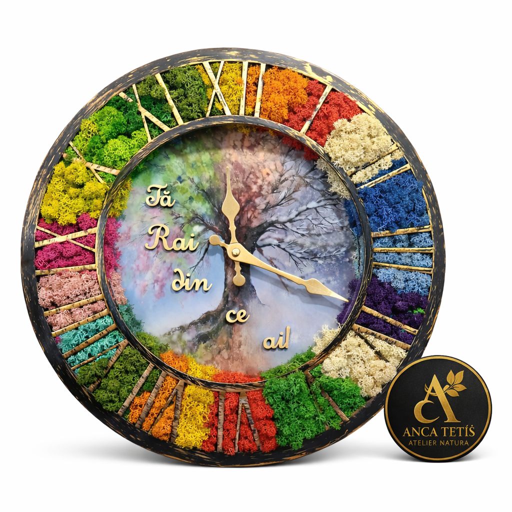 Ceas de perete multicolor "Fă rai din ce ai" – ceas decorativ perfect funcțional, realizat manual și decorat cu licheni stabilizați multicolori. Potrivit ca cadou care rămâne sau element de decor pentru casă ori birou.