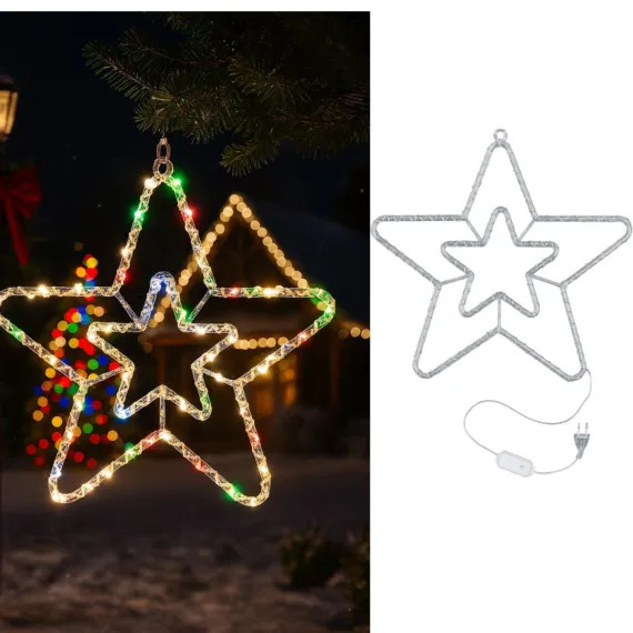 Această decoratiune spectaculoasă în formă de stea, cu dimensiunea de 45x45cm, aduce spiritul Crăciunului în orice spațiu, transformând instant atmosfera într-una caldă, festivă și plină de culoare. Realizată din materiale transparente de înaltă calitate, steaua este prevăzută cu lumini LED multicolore, atent distribuite pe întreaga structură, oferind un joc vizual impresionant de reflexii și străluciri. Este o alegere ideală pentru decorarea vitrinelor, ferestrelor, ușilor, teraselor, pomilor de Crăciun sau chiar a spațiilor comerciale, datorită designului său modern și efectului său vizual deosebit.ceastă decoratiune spectaculoasă în formă de stea, cu dimensiunea de 45x45cm, aduce spiritul Crăciunului în orice spațiu, transformând instant atmosfera într-una caldă, festivă și plină de culoare. Realizată din materiale transparente de înaltă calitate, steaua este prevăzută cu lumini LED multicolore, atent distribuite pe întreaga structură, oferind un joc vizual impresionant de reflexii și străluciri. Este o alegere ideală pentru decorarea vitrinelor, ferestrelor, ușilor, teraselor, pomilor de Crăciun sau chiar a spațiilor comerciale, datorită designului său modern și efectului său vizual deosebit.
