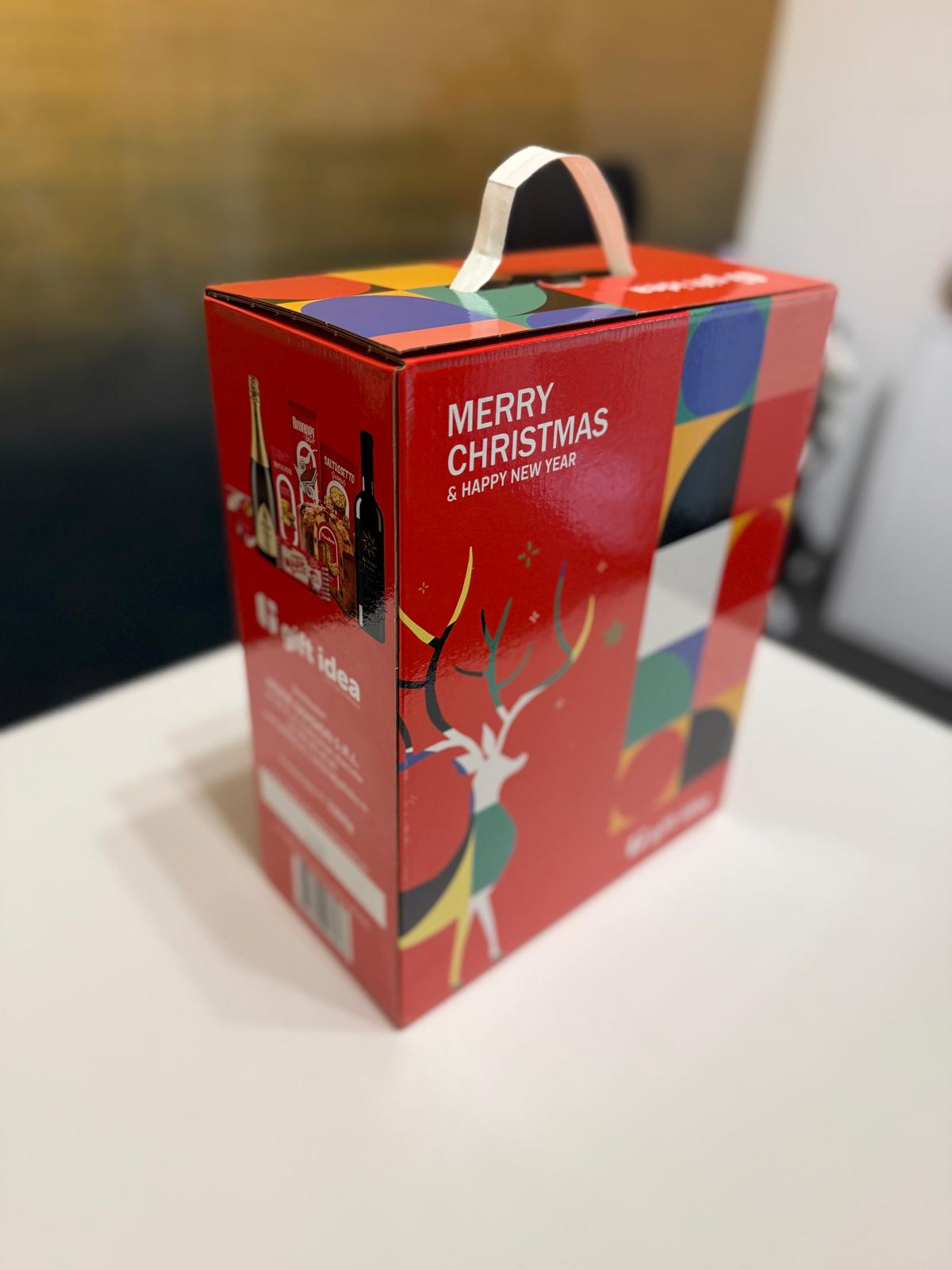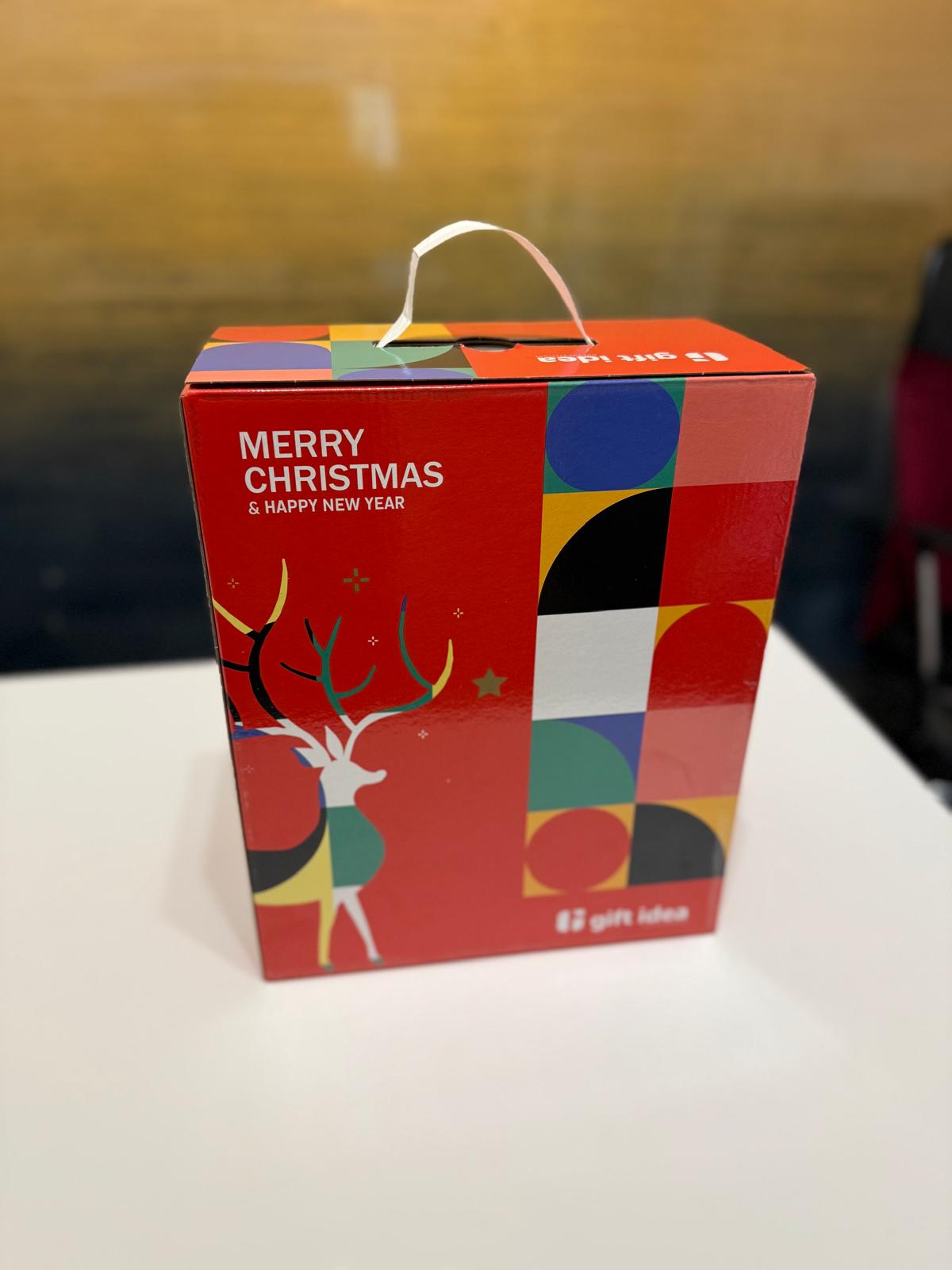 Cutie elegantă, cu mâner, decorată cu tematică de Crăciun – gata de oferit fără să fie nevoie de ambalare suplimentară.