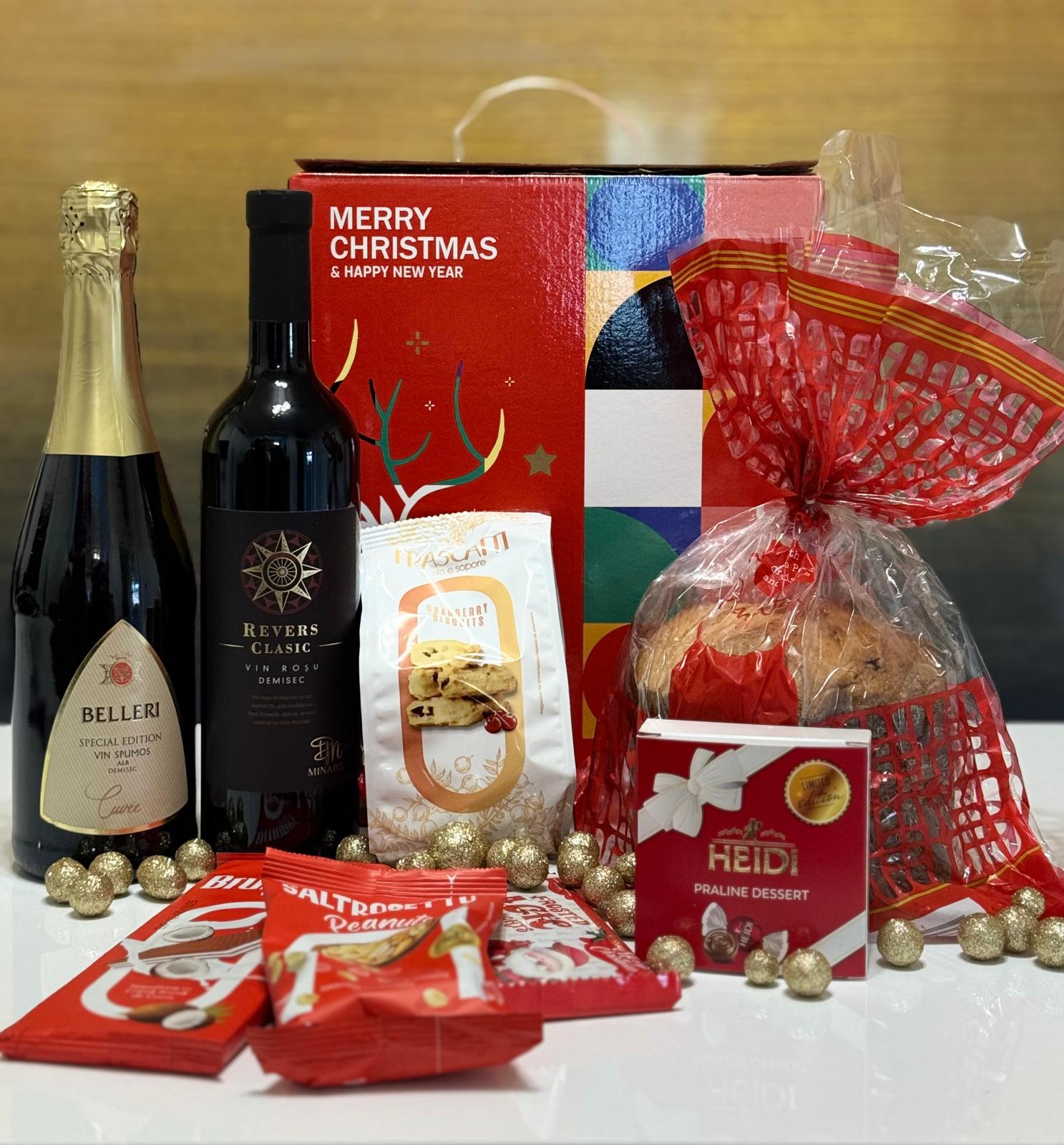 Un cadou elegant și complet pentru sărbători, perfect pentru familie, colegi, parteneri de afaceri sau pentru orice ocazie festivă. Cutia conține o selecție atent aleasă de băuturi, dulciuri și produse gourmet, toate ambalate într-o cutie premium cu design de Crăciun.