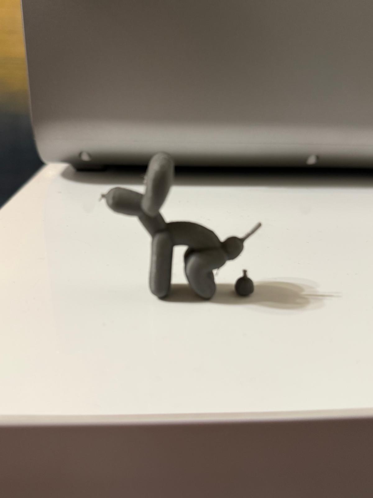 Figurină decorativă realizată prin imprimare 3D, reprezentând un câine stil "balon", într-o variantă amuzantă și nonconformistă. Ideală ca obiect de decor, cadou funny sau piesă de birou care atrage atenția.