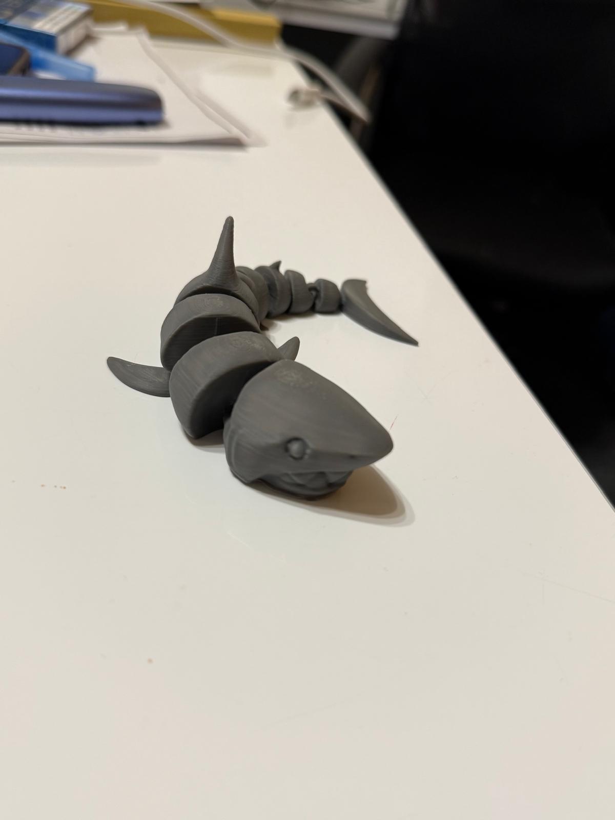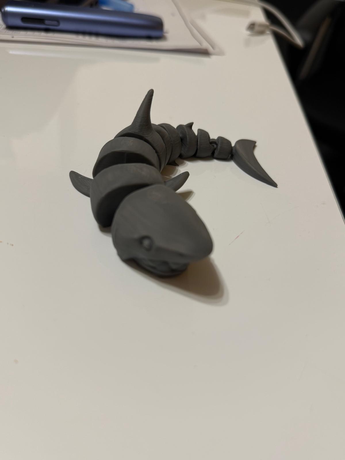 Figurină decorativă în formă de rechin, realizată la imprimantă 3D, cu corp segmentat și design articulat. Piesele mobile permit mișcarea naturală a corpului, oferind un efect vizual dinamic și atractiv.