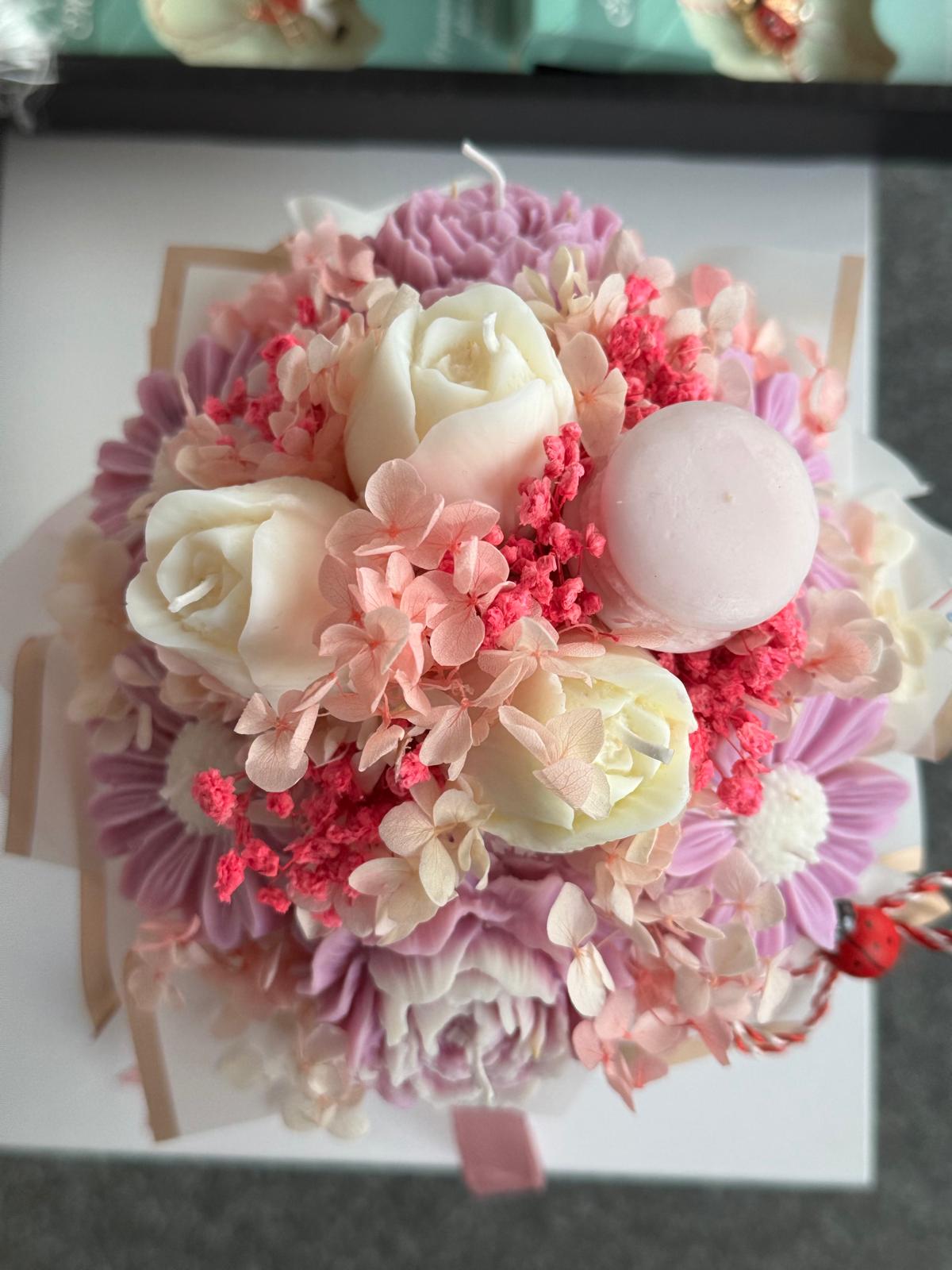 Această lumânare decorativă este realizată integral din ceară naturală de soia și modelată manual sub forma unui buchet floral elegant, în nuanțe fine de roz, crem și lila.