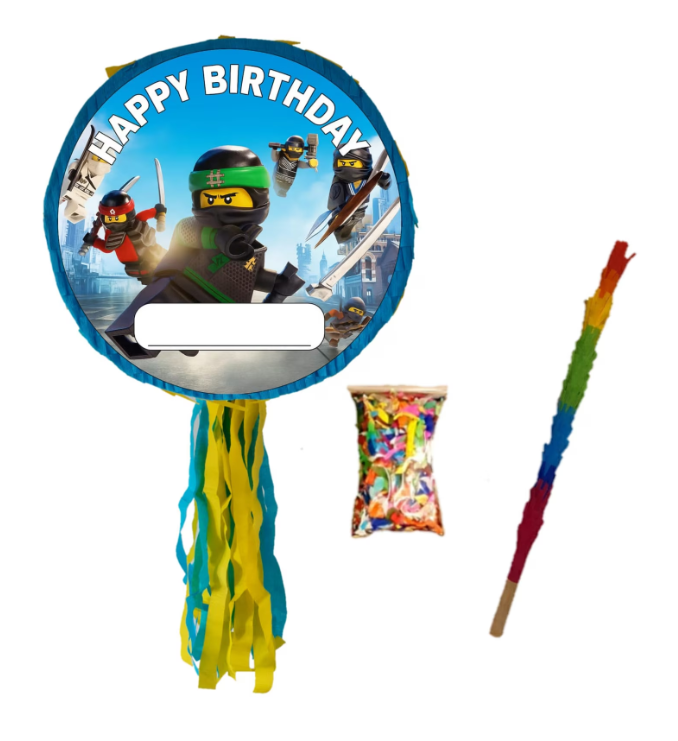 Dimensiuni aproximative de 60 de cm(cu franjuri) pe 33 cm(diametru). Capacitate de umplere aproximativ 8-10 litri. Rezista, cu o sarcina indicata de maxim 2 kg a umpluturii, la aproximativ 30 de lovituri a unui copil de 7-10 ani. Pentru a se sparge mai repede(in cazul copiilor mai mici ) este indicat sa perforati zona inferioara a pinatei! Bat din lemn! Confectionate din materiale ecologice: hartie, carton si hartie creponata certificata TUV.