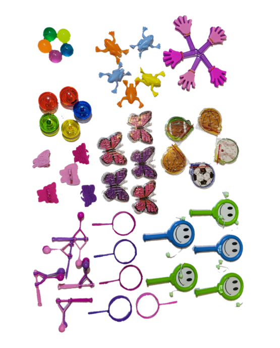 5 bratari fete,5 ceasuri fete, 5 inele fluturasi fete, 5 fluiere fete,5 fluiere baieti, 5 mingiute baieti, 5 yoyo fete, 5 yoyo baieti,5 joculet fluture fete, 5 lupe fete, 5 lupe baieti, 5 bate palma fete, 5 bate palma baieti,5 broscute fete, 5 broscute baieti ,5 joc baieti, 5 bate toba baieti, 5 sunatoare fete,5 titirez baieti, 5 sunatoare baieti.