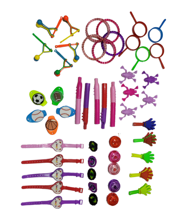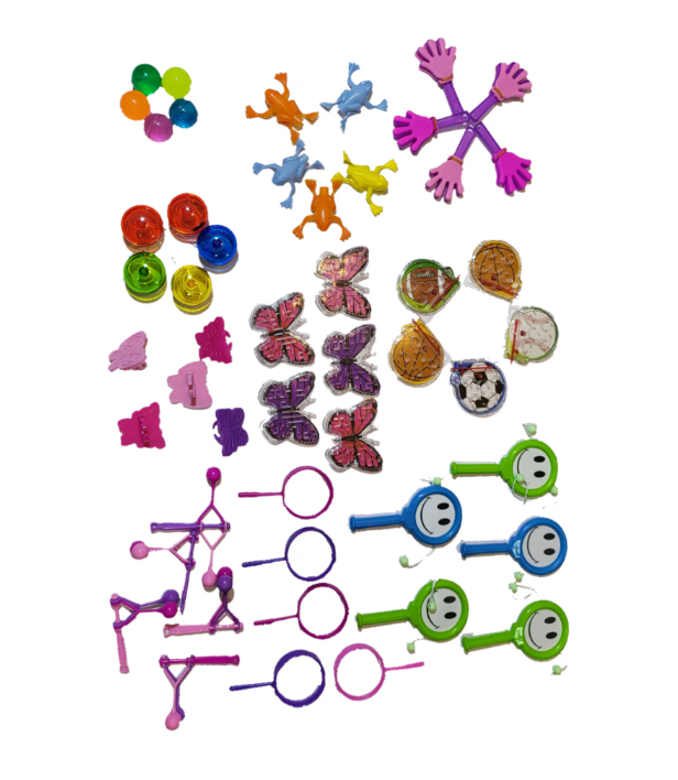5 bratari fete,5 ceasuri fete, 5 inele fluturasi fete, 5 fluiere fete,5 fluiere baieti, 5 mingiute baieti, 5 yoyo fete, 5 yoyo baieti,5 joculet fluture fete, 5 lupe fete, 5 lupe baieti, 5 bate palma fete, 5 bate palma baieti,5 broscute fete, 5 broscute baieti ,5 joc baieti, 5 bate toba baieti, 5 sunatoare fete,5 titirez baieti, 5 sunatoare baieti.