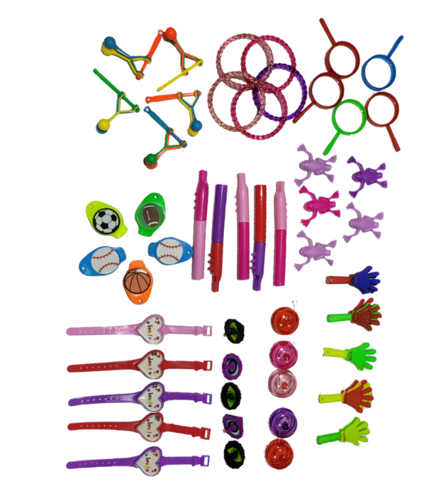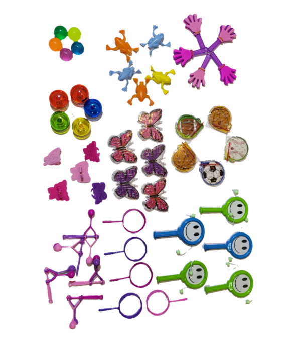 5 bratari fete,5 ceasuri fete, 5 inele fluturasi fete, 5 fluiere fete,5 fluiere baieti, 5 mingiute baieti, 5 yoyo fete, 5 yoyo baieti,5 joculet fluture fete, 5 lupe fete, 5 lupe baieti, 5 bate palma fete, 5 bate palma baieti,5 broscute fete, 5 broscute baieti ,5 joc baieti, 5 bate toba baieti, 5 sunatoare fete,5 titirez baieti, 5 sunatoare baieti.