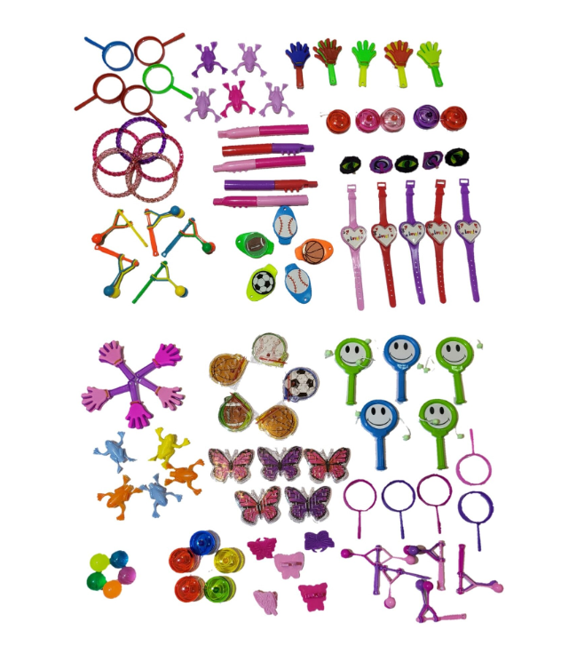 5 bratari fete,5 ceasuri fete, 5 inele fluturasi fete, 5 fluiere fete,5 fluiere baieti, 5 mingiute baieti, 5 yoyo fete, 5 yoyo baieti,5 joculet fluture fete, 5 lupe fete, 5 lupe baieti, 5 bate palma fete, 5 bate palma baieti,5 broscute fete, 5 broscute baieti ,5 joc baieti, 5 bate toba baieti, 5 sunatoare fete,5 titirez baieti, 5 sunatoare baieti.