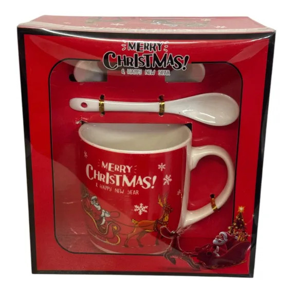 Setul este format dintr-o cană cu o farfurie cu linguriță și vine ambalat într-o cutie elegantă cu motive de Crăciun.