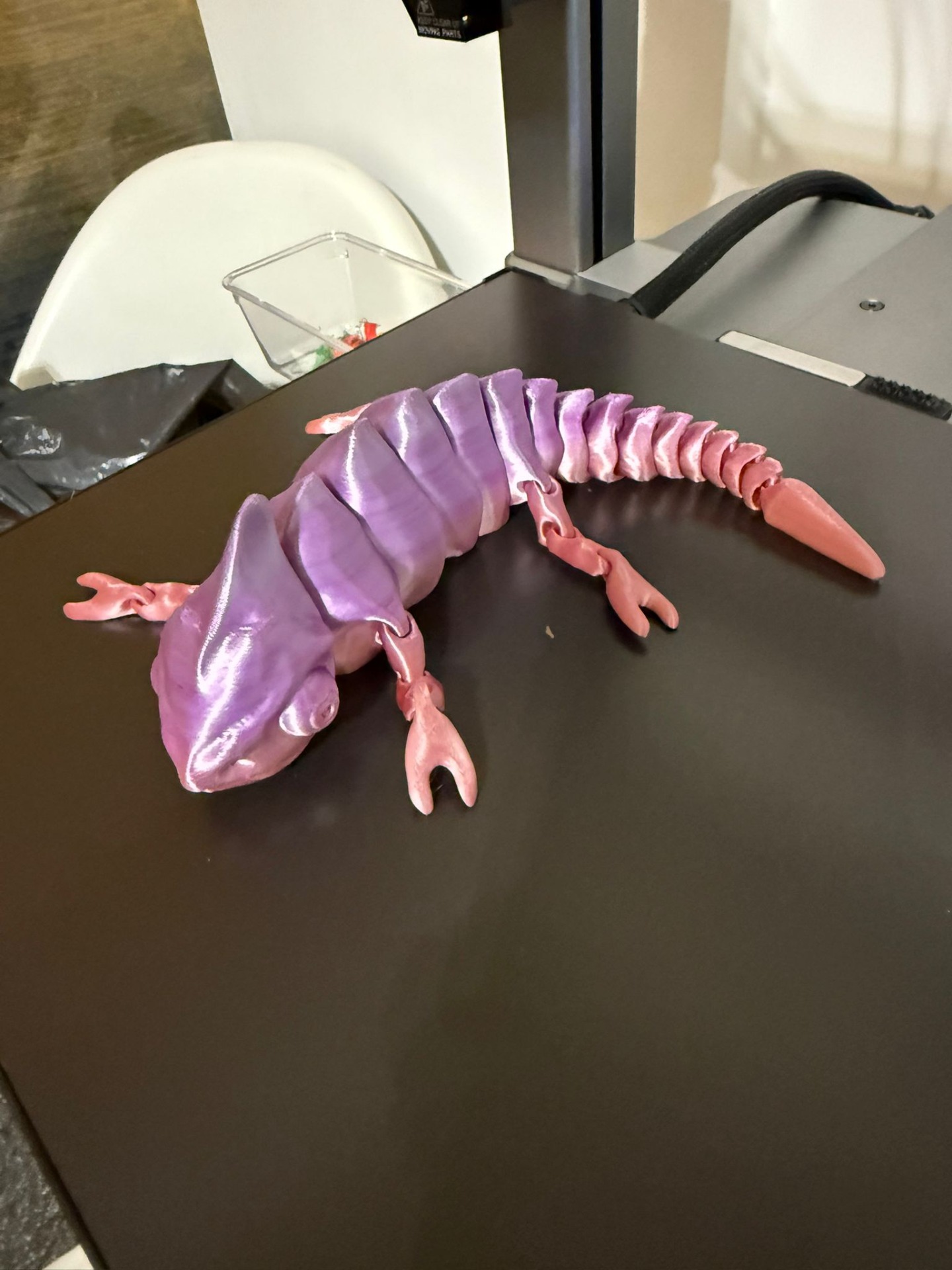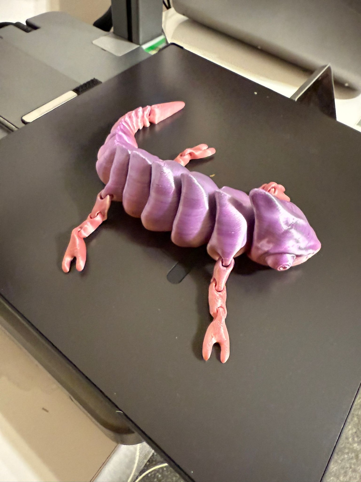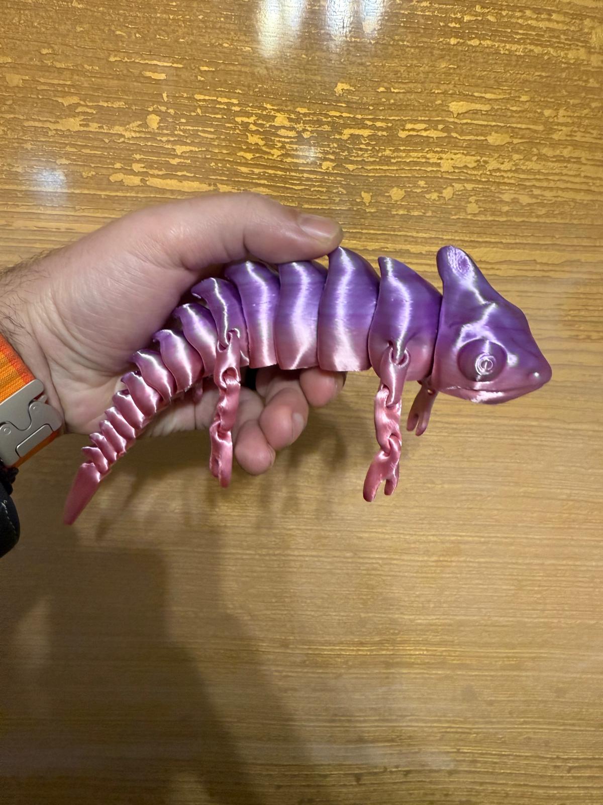 Șopârlă decorativă printată 3D, cu design articulat complet, realizată din filament tip silk, cu un efect lucios spectaculos în nuanțe de mov–roz. Modelul este flexibil, plăcut la atingere și foarte atrăgător vizual.