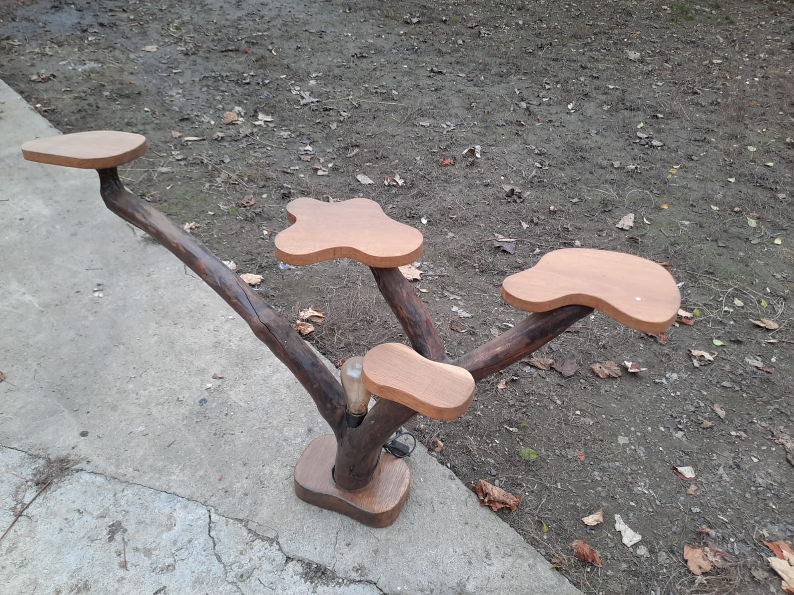 Structura sculpturală permite susținerea mai multor ghivece la diferite înălțimi, oferind un efect vizual dinamic. Platourile sunt finisate manual pentru stabilitate și durabilitate, iar lemnul este tratat astfel încât să își păstreze textura și culoarea naturală.