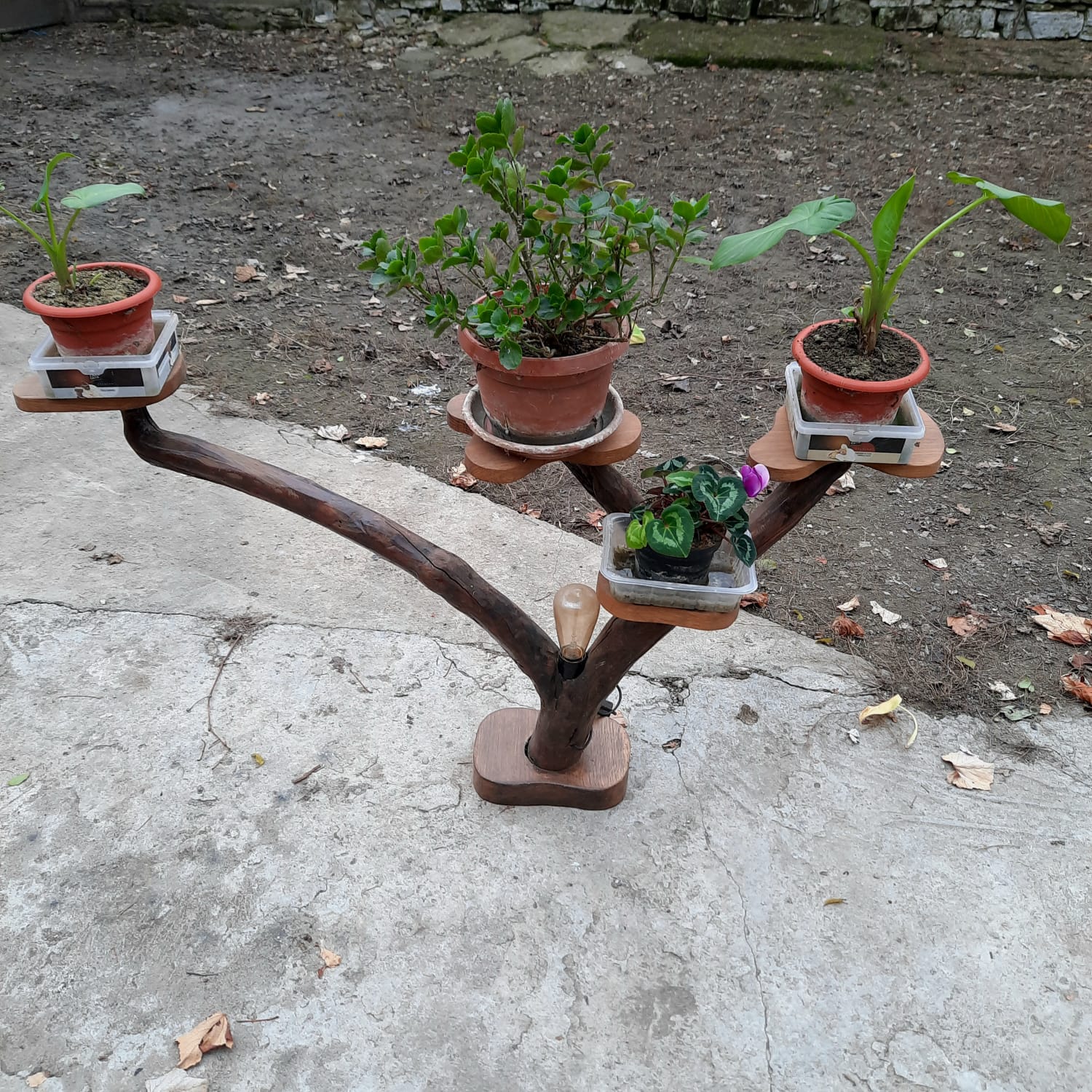 Suport de flori realizat manual din lemn masiv natural, cu design organic inspirat din formele naturale ale ramurilor de copac. Piesa îmbină funcționalitatea cu estetica decorativă, rezultând un obiect unic care pune în valoare atât plantele, cât și ambientul în care este amplasat.