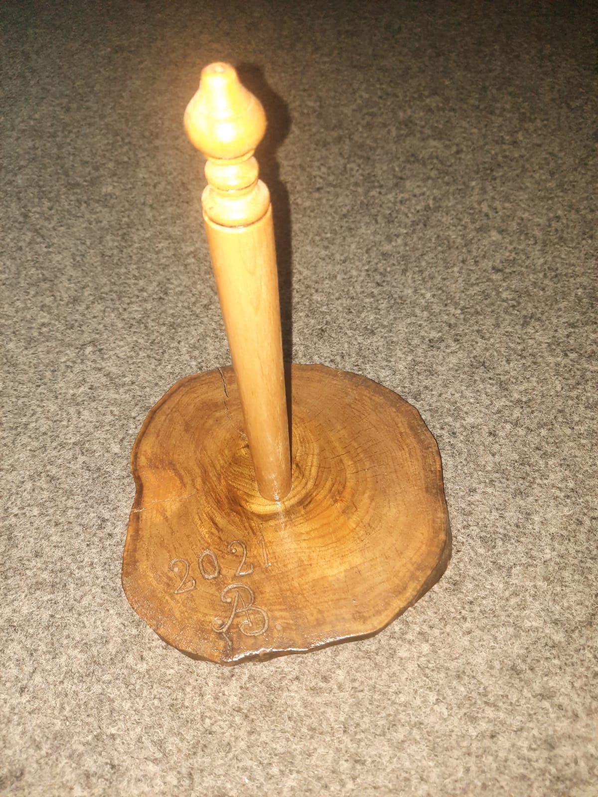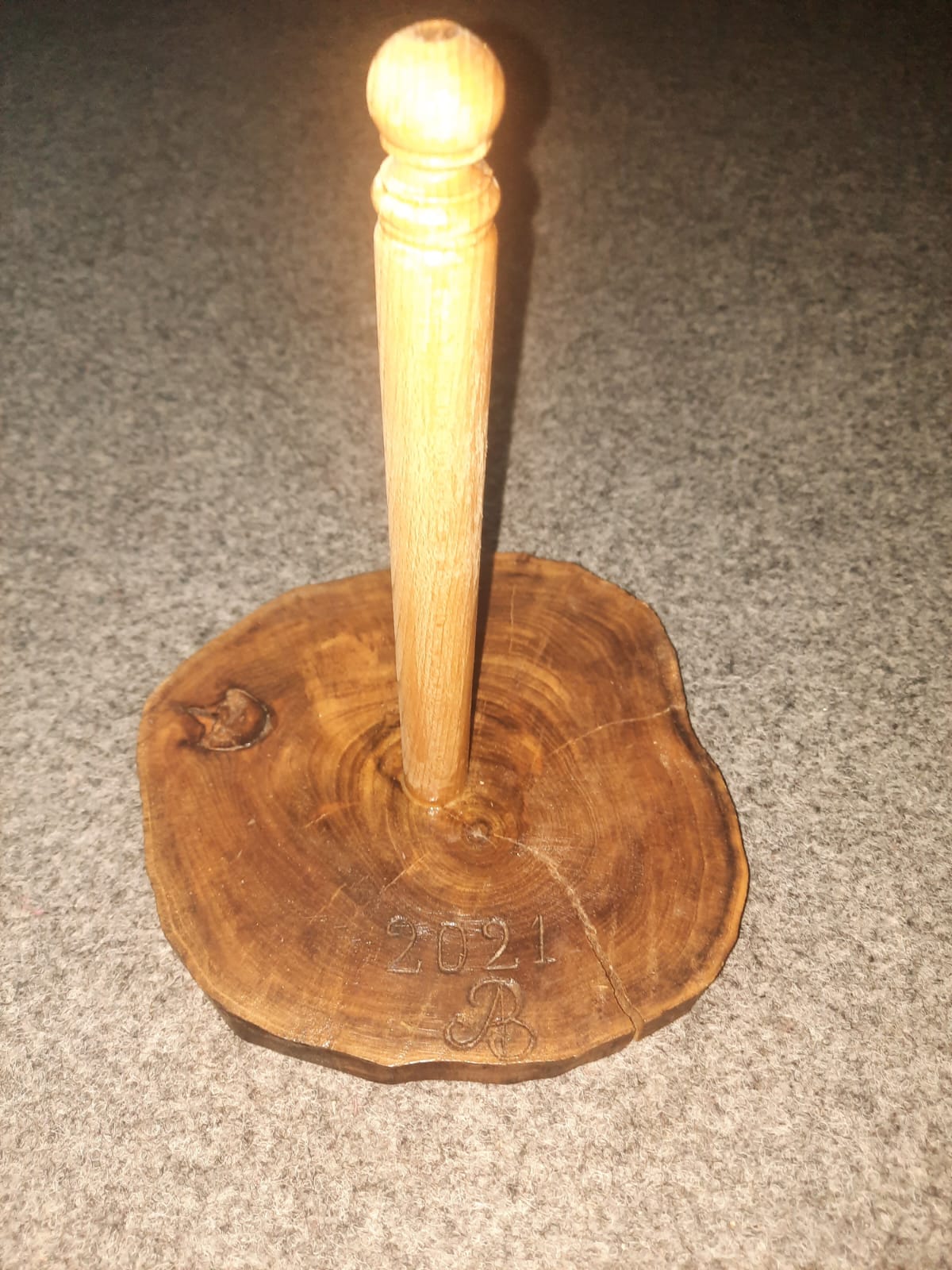 Suport pentru prosop de bucătărie realizat manual din lemn natural, cu design simplu și elegant, potrivit atât pentru bucătării rustice, cât și pentru cele moderne cu accente naturale. Baza este realizată dintr-o felie de lemn masiv, care păstrează forma și fibra naturală, oferind stabilitate și un aspect autentic.