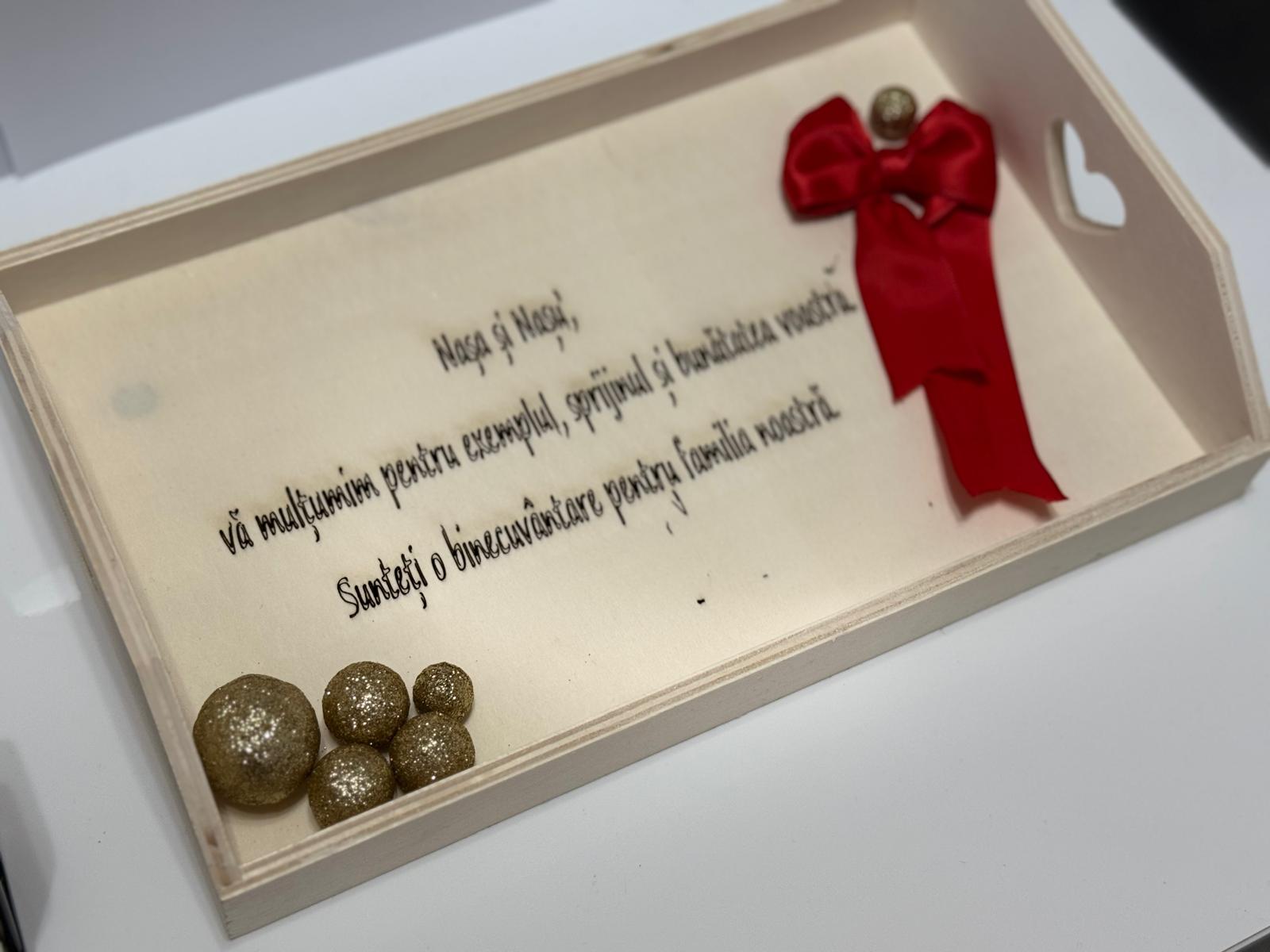O tăviță elegantă din lemn, decorată manual și personalizată cu mesajul tău preferat. Gravura realizată cu laser oferă un aspect fin, precis și de durată, transformând fiecare tăviță într-un cadou unic și plin de emoție.